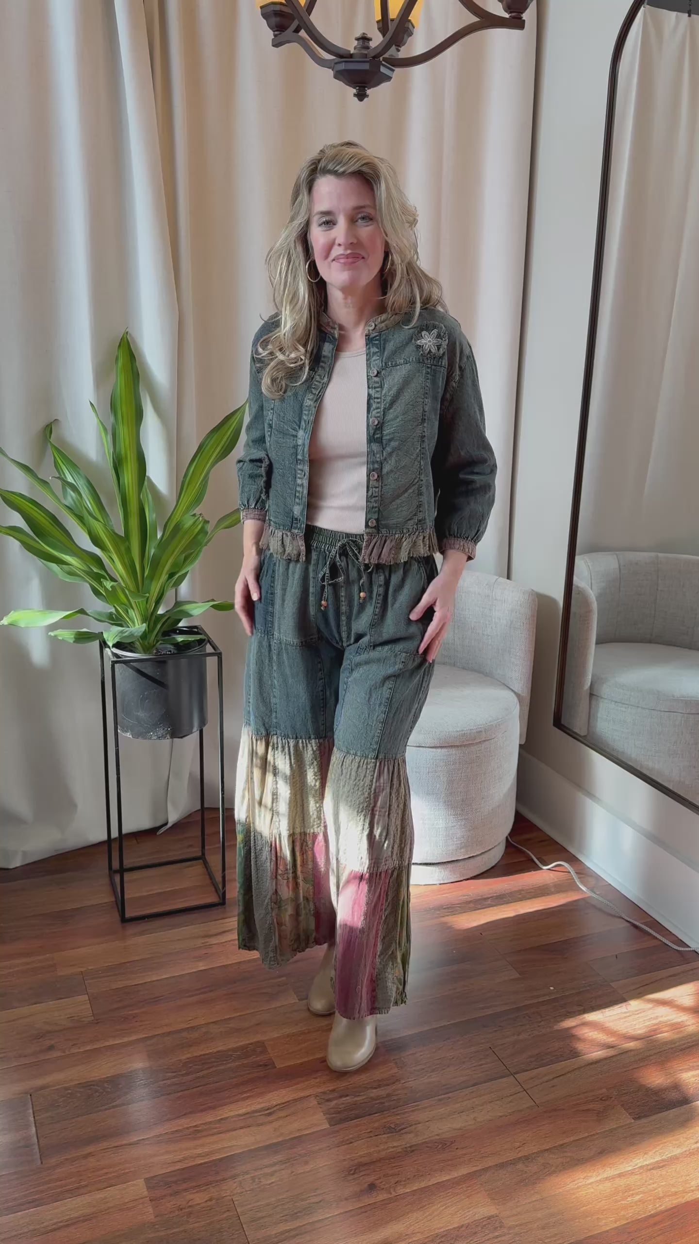 Drift into effortless boho charm with the Dusty Roads Patchwork Jacket. This cropped denim layer captures the soul of the open road — detailed with frayed floral appliqués, soft ruffled patchwork trim, and a worn-in vintage wash that feels like it’s been part of your story forever. Designed for easy layering over dresses, tanks, or maxi skirts, it brings a free-spirited finish to every outfit.